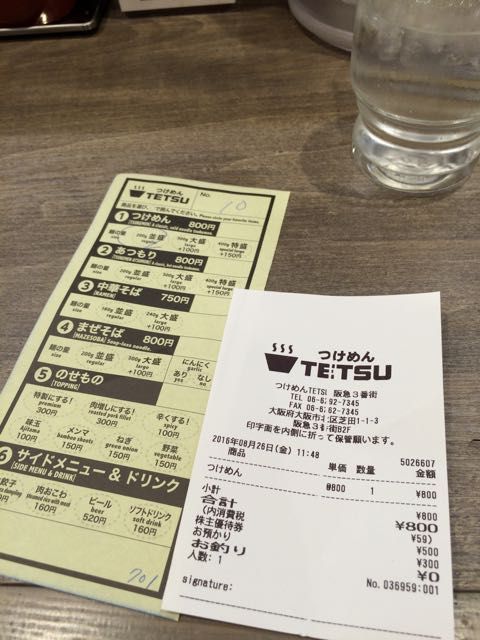 本来はなるべく優待券のきりのいい金額に揃えるように努力するのですが、今回は初利用ということで定番のつけめん800円(税込み)のみにしました。優待券500円と現金300円。1人で食べるなら150円のオプションをつけて2枚出して50円放棄か、水餃子350円で2枚+現金150円にするかなあと思います。