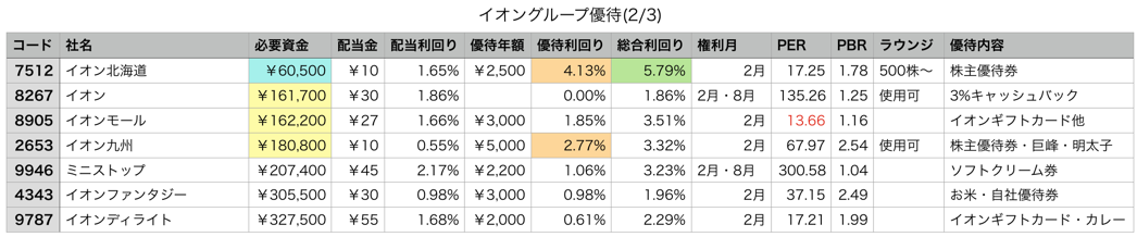 ギフトカードを優待で出しているのはイオン(1,000株以上)、イオン九州、イオンモール、イオンディライト。