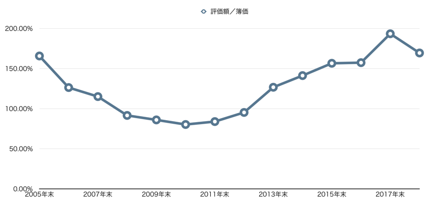 2012年以降評価額はうなぎ登りに上昇して2017年末時点で投資額合計の2倍近くにまで成長。それがよくわかるように「資産評価額÷投資元本」の比率をグラフにしてみた。2008年から2012年までは元本割れが続いていまるが、その後は上昇を続けて2017年末にはほぼ投下資本の2倍となった。が、2018年は一転マイナス。それでも2016年末の評価額と比べて若干のプラスが残った。2019年はこの2016年末よりは上を維持できればいいなあ。