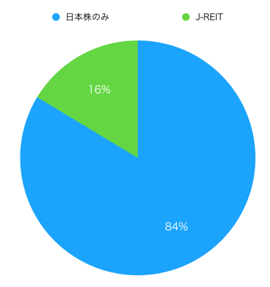 私のポートフォリオはほぼ全力日本株一点投資となっている。使用している証券会社ではJ-REITは日本株扱いなので、正確な評価額はわからないのだが、一応概算で保有比率を出した。日本株84%、J-REIT 16%。投資信託、内外の債券、外国株等一切無し。