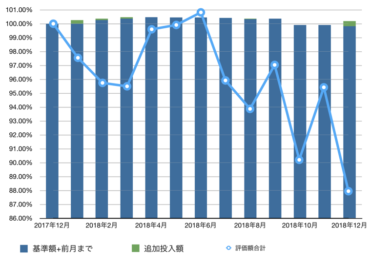 折れ線グラフは評価額の推移。棒グラフは追加投入額も含めた2017年末比。今年もほとんど追加資金の投入はなかったのだが、必要があって一時資金を出して再投入している。最終的に微増。