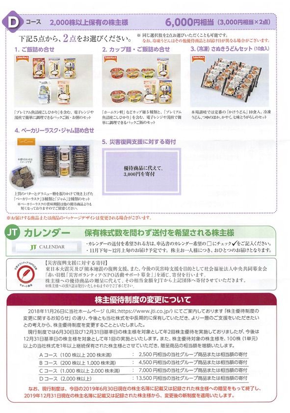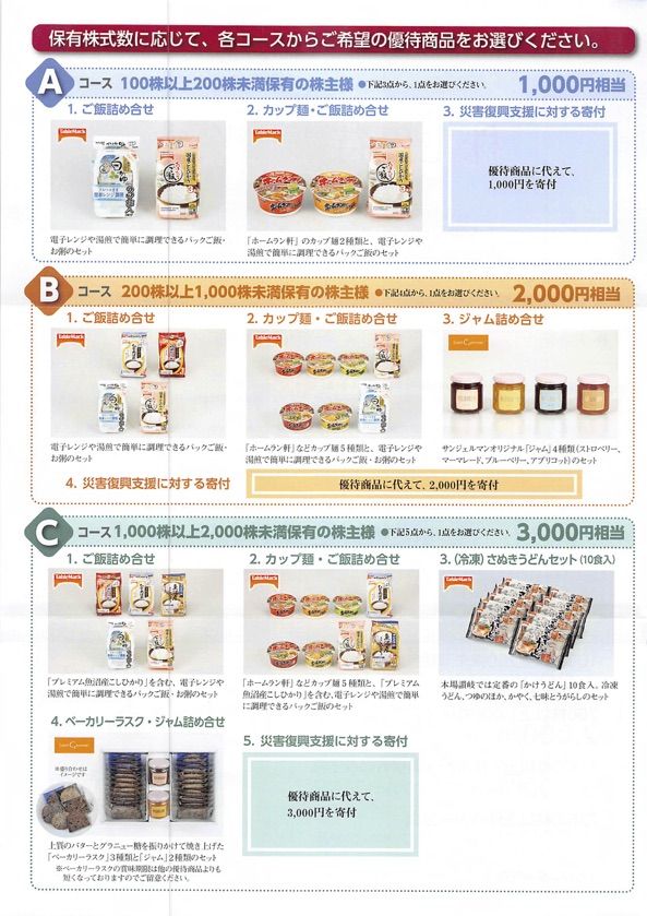保有株数に応じて、各々数コースから選択する。100株保有で1,000円相当、200株保有で2,000円相当、1,000株保有で3,000円相当、2,000株以上で6,000円相当。100株ではご飯、カップ麺・ご飯詰め合わせ、200株ではそれにジャム詰め合わせ、1,000株以上であればにさぬきうどんセットが追加される。申込〆切は8月29日必着。申込ハガキを返送しなかった場合には、会社指定の商品が送られてくる。ただ、次回権利から年1回に変更になる。また1年以上継続保有という長期保有条件も追加されることが発表されている。