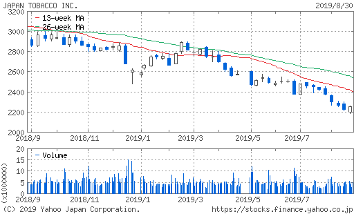 高い配当利回りが魅力的で今回買い増したが、株価は長期的に右肩下がりを続けておりなかなか止まらない。今後、投資信託や年金資金など他人資金で投資するファンド等は健康に悪影響のある商品を販売する会社の株は買わなくなるとの見込みで買い手が減るという見込みらしい。財務健全で今後も利益成長を期待でき、しかも7%近い超高配当は魅力的。だが今後も株価が下がる可能性を考えるとこれ以上に買い増す勇気は出ない。