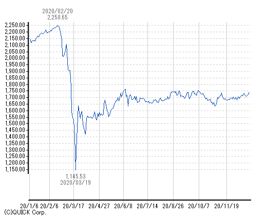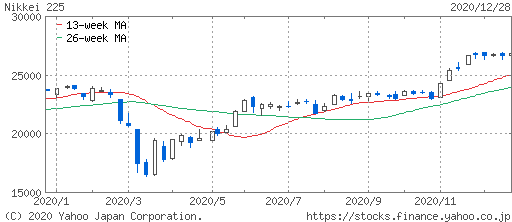 11月に2万6千円台を超えるまで急上昇したが、その後は2万7千円に挑戦し12月21日場中高値26,905.67円をつけた。が、2万7千円は超えることなく2万6千円台で推移した。日本を含む各国で新型コロナウイルス感染症の第三波で外出自粛やロックダウンが広がる一方で、ワクチンの開発も進展してどちらか一方に大きく動くこともなかった。日本ではGO TOイート、GO TOトラベルへの制限から中止に進み、外食産業や旅行業界には再び打撃となり株価も軟調となった。