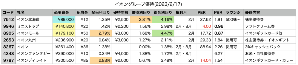イオングループは多数上場しており2月末日決算がほとんど。またその大部分が株主優待制度を持っている。地域ごとのスーパーマーケット事業を担う企業は、主としてその地域で成長してきた既存企業を買収したものもありかなり細分化され、別別に上場していた。