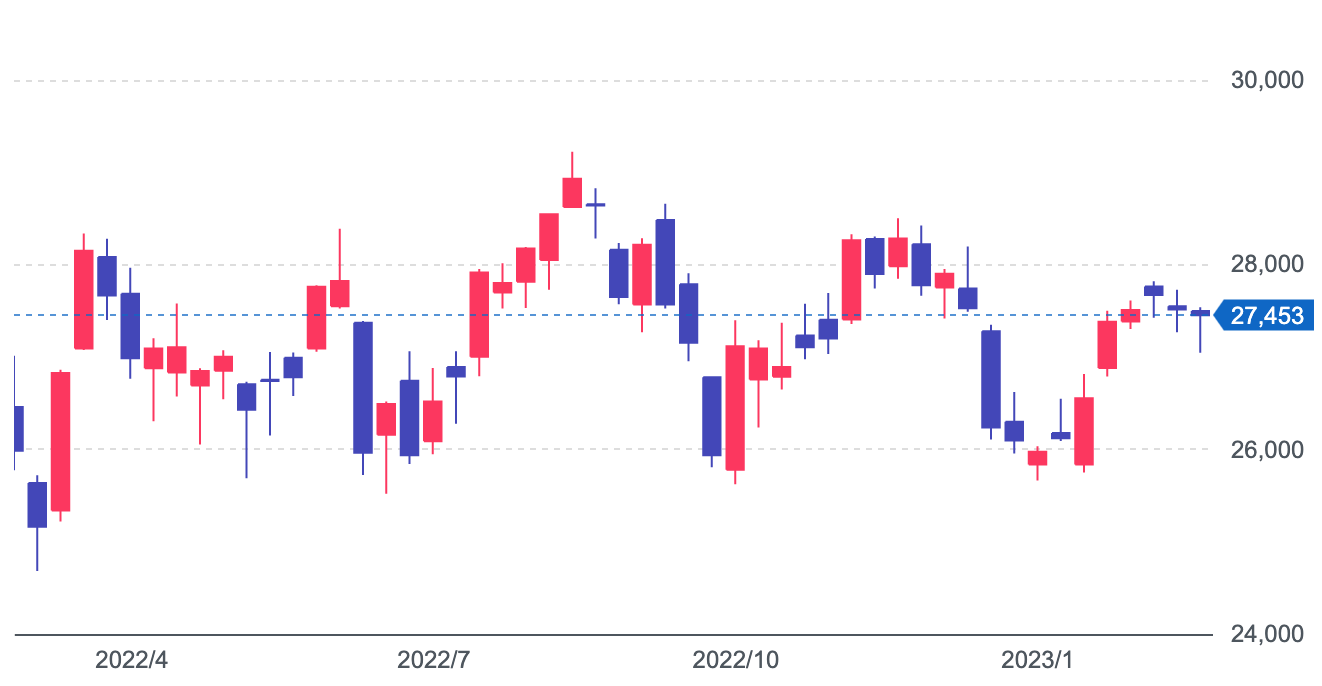 この一ヶ月の株価は小康状態。2万7千円台で上下するだけ。米国景気指数は方向感なく金利動向も大きな動きなし。ウクライナ情勢にも変化はなし。日本銀行次期総裁に植田和男氏が内定。金融政策に関しては黒田総裁からの変更はなさそう。