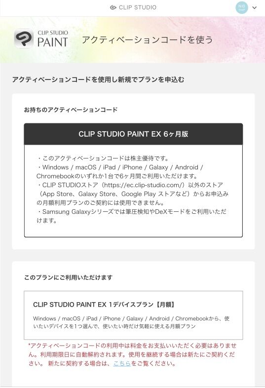 世界中でプロが使用するコミック・イラスト・アニメーション作成ツールのCLIP STUDIO PAINT EXを6ヶ月間1デバイスで使用することができるアクティベーションコード。Windows / macOS / iPad / iPhone / Galaxy / ANdroid / Chromebookから1つのデバイス上で使える。アプリのダウンロードとアカウント登録が必要。以前からの続きで使うつもりだったが、登録前に有効期限が切れて追加ではなく新規の契約となってしまった。有効期限切れの1週間前などに通知してくれればいいのに、期限切れになってからメールが届いた。もしかして見落としていたのだろうか。2023/4/17に登録したので、利用期限は2023/10/17まで。なお利用開始期限があり2023/4/30までに登録しなければならない。1デバイスプランの月額料金は980円税込みだが、年額プラン7,800円で優待利回りを計算すると11.49%になる。