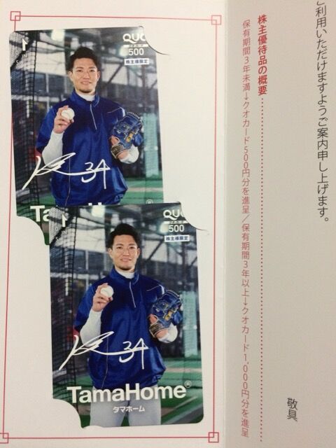100株以上一律500円のクオカード。3年以上継続保有で1,000円に増額。3年未満での優待利回りは0.24%。デザインは多分プロ野球選手。