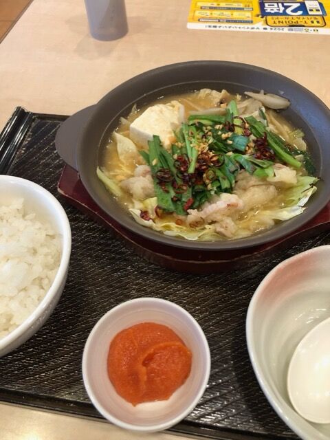 今回は博多明太もつ鍋としてあごだし醤油味と、こく味噌味の2種類と、レギュラーメニューに明太子をアレンジしたメニューが期間限定メニューとして登場した。食べたのは博多明太もつ鍋〔こく味噌〕ごはん付き。