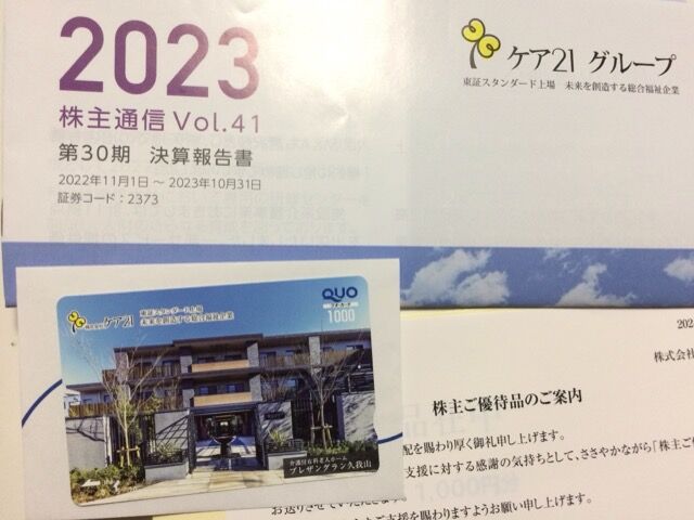 2/1にケア21から株主優待が届いた。普通郵便、株主総会決議通知同封。