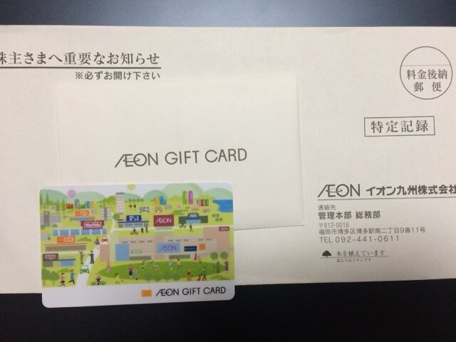 ※追記:6/10イオン九州 から選択した商品が届いた。5/1選択ハガキを投函し、6/10特定記録郵便で受け取り。特定記録郵便はポストへ投函するが、投函記録を郵便会社で残すもの。書留みたいに直接受取人に手渡すわけではないが、いつ投函したかなど記録が残らず事故のあった場合に投函したかどうか分からないということもない。中間的な安全性のある郵便。たしかに金券で誰かに抜き取られた場合に金銭的損害の出るものなので安心だね。選択したのはイオンギフトカード。イオンでの買い物は日常的に使うので大変ありがたいし、すぐに使い切る。[8267]イオンの株主カードによるキャッシュバック対象にもなり実質3%増し。