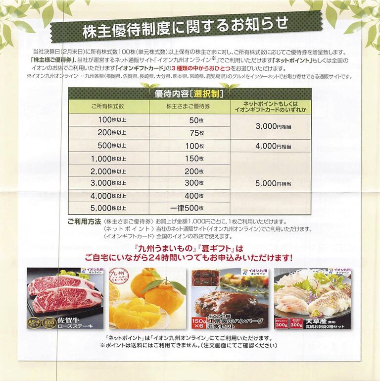 4/30にイオン九州から株主優待案内が届いた。普通郵便、株主総会招集通知同封。