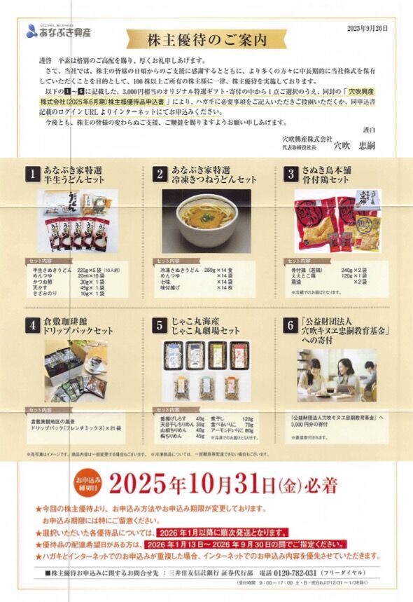 100株以上一律。3,000円相当の商品選択。2025/10/31必着。ただし発送は2026年1月以降になる。ハガキの返送またはWebからの申し込み。