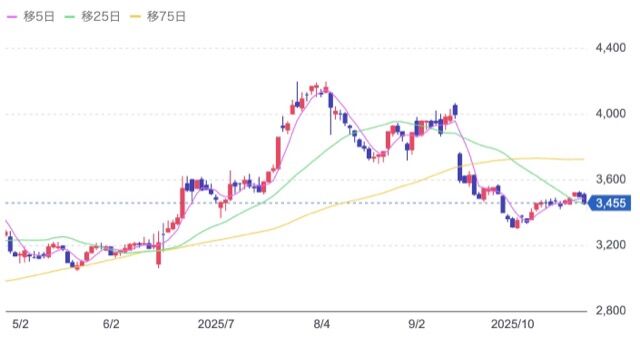 経常利益:2025年10月期予測/52.0億円(中間実績/29.9億円【前年同期比△ 50.1%】、経常利益率約2.5%)