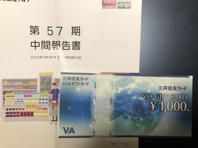 天満屋ストアから選択した商品が届いた。往復葉書は返送せず、11/10に普通郵便、中間報告書同封で受け取った。JVAギフトカード1,000円。汎用性があり有効期限がないので、株主優待の使えない百貨店やショッピングモールのお店で洋服や財布、鞄等の雑貨類を購入する時に使っている。が、まあそんなことは年に1回あるかないか。