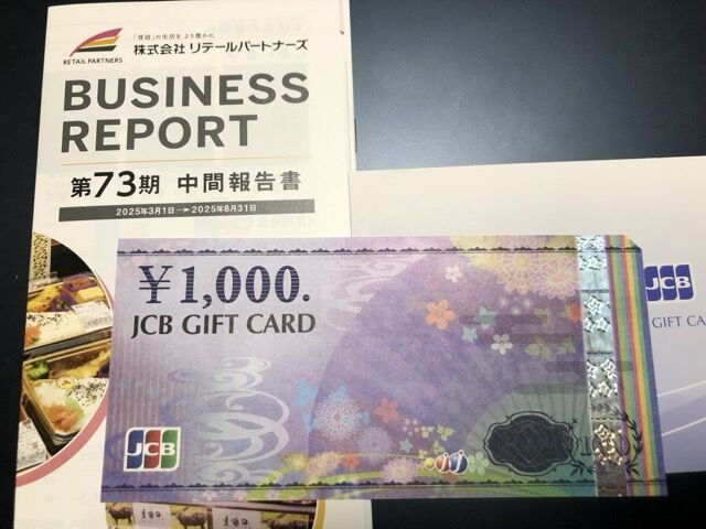 リテールパートナーズから選択した商品が届いた。往復葉書は返送せず、11/19に普通郵便、中間報告書同封で受け取った。JCBギフトカード。汎用性があり有効期限がないので、株主優待の使えない百貨店やショッピングモールのお店で洋服や財布、鞄等の雑貨類を購入する時に使っている。VJAギフトカードのほうが使えるお店は多いと思うが、ある程度大きなお店ならJCBギフトカードも問題なく使えるし、ユニクロが自社商品券とJCBギフトカードしか使えなかったはずなのでJCBのほうが嬉しい。もっともユニクロは何年も使っていないので今どうなっているのかは不明。