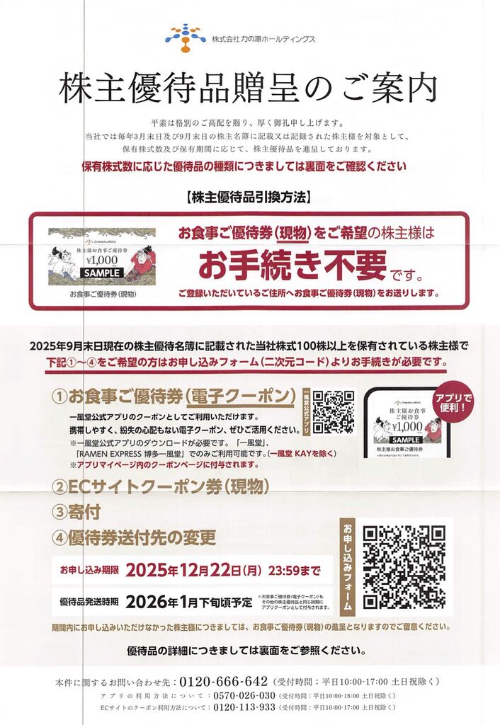 優待券の有効期限は2026/7/31。電子クーポンにするメリットが見当たらないので現物を選択することにする。その場合には申し込み不要。他の選択をする場合には2025/12/22までQRコードを読み取ってネットで申し込む。今まで使ったことがないし、レジでスマホ操作に手間取ってもたもたするのが嫌なので紙の方がよさそう。一風堂は利用経験がないので今回はお試し。優待券を使って食べてみてよければリピートするかもというところ。