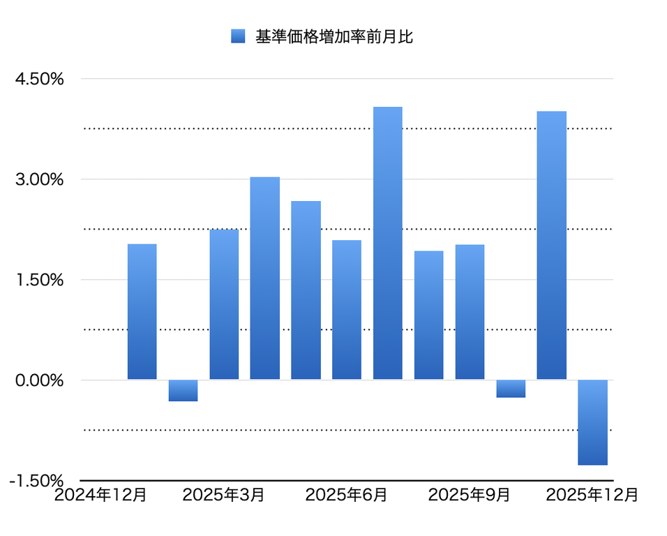 ほぼ一貫して毎月2%前後の上昇で、2月・10月は微減だがほぼ増減なしと言える。そして7月と11月は4%程度の上昇。12月に1.5%のマイナス。結果的に毎月2%プラスの24%増という結果。