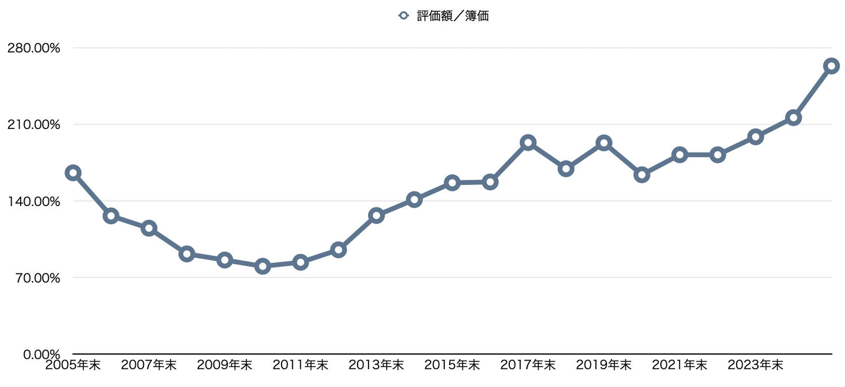 こちらは2005年末の評価額を100として指数化。この時点で投資元本(簿価)は評価額の60%程度。その後、日本株は急速に下落してくのだが、適時追加投資していき2008年には投資額に比べて保有株の評価額はマイナスに下落。その後もマイナスが続き2009年に底を打ちながらも低迷を続けた。2012年以降評価額はうなぎ登りに上昇して2017年末時点で投資額合計の2倍近くにまで成長。2018年に一時評価額は下落。2020年は追加資金の投入があり総資産自体は横ばい。2021年から2024年は順調増加を続けている。そしてグラフを見ても2025年の上昇幅の異常性が見て取れる。2025年はさすがに上がりすぎだと思う。