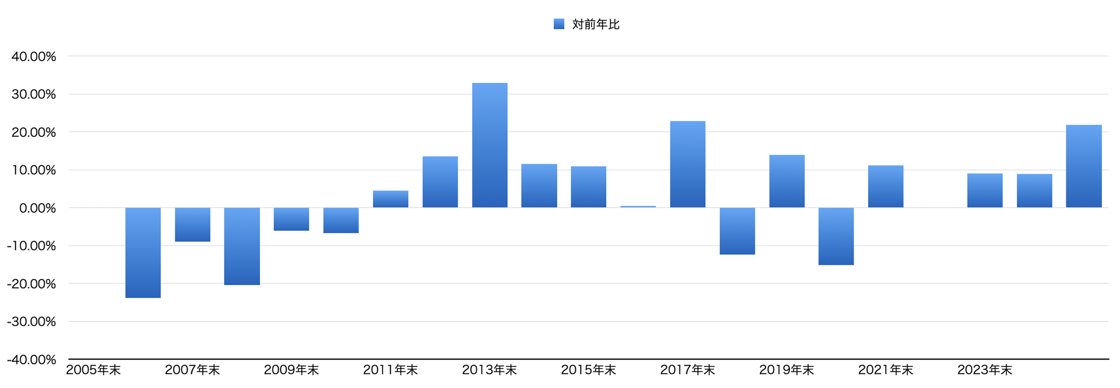対前年比の増減を示すと以下。2006年から2010年まではずっと前年末比マイナス。その後マイナスになった年は2回だけで、以後はほぼゼロの年以外は各年10%前後はプラスになり2013年・2017年・2025年の3回は20%以上のプラス。日本株への投資は買ったり負けたりだが、長期間にならせばまあまあいい感じの増加となることがわかる。2005年ごろまでの日本市場が異常だったため日本株はダメだ、投資するなら米国株や世界株にという時代は過去のものと感じる。