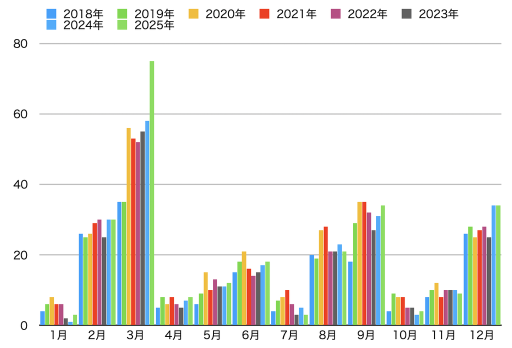| 3月 | 35 | 35 | 56 | 53 | 52 | 55 | 58 | 75 | 17 |