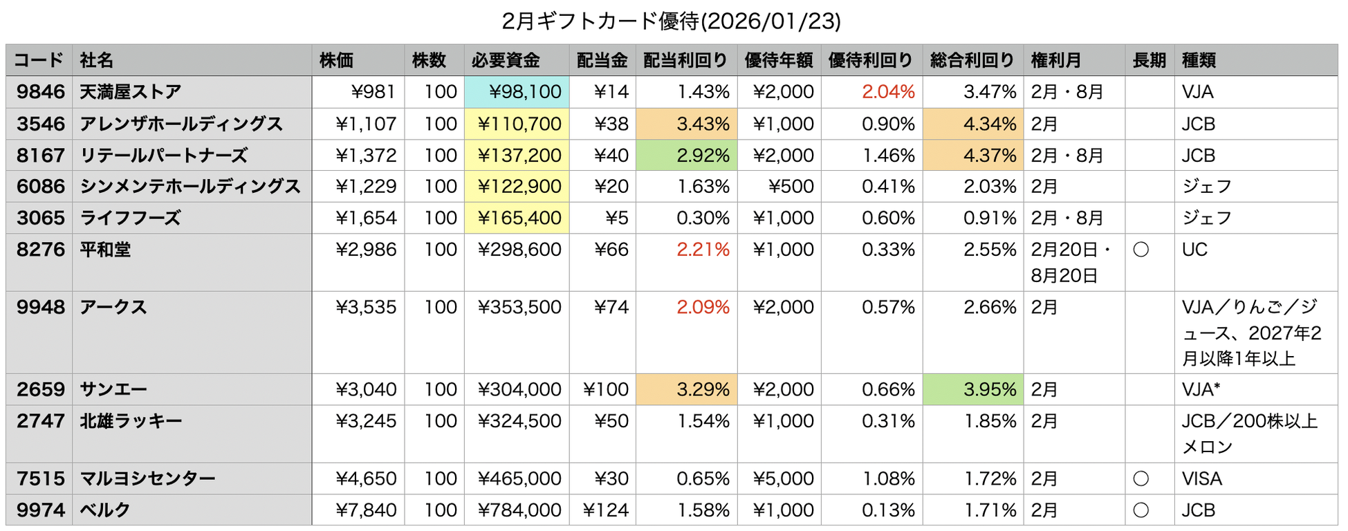 金券優待は多くの場合には金額・利回りが重要で個々の商品の魅力が関係ないことが多い。なので利回りを重要な指標として銘柄選択を行う。3月・9月は銘柄数が多く手に負えないので作成していないが、それ以外の月は利回り調査をして購入するかどうか検討材料にしている。2月はQUOカード以外の銘柄が多いので、QUOカード・図書カードとギフトカード系と別々に集計している。なお、通常は金券に分類されるお米券は自分が使用しないため対象外としている。また今回のみ権利をとっても優待をもらえない長期継続保有条件のついている銘柄も対象外。