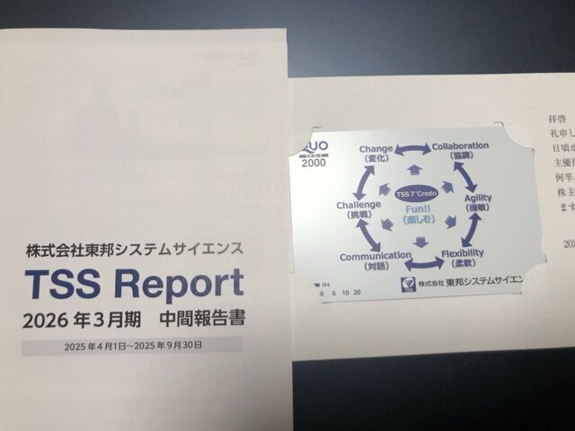 12/9に東邦システムサイエンスから株主優待が届いた。普通郵便、中間報告書同封。