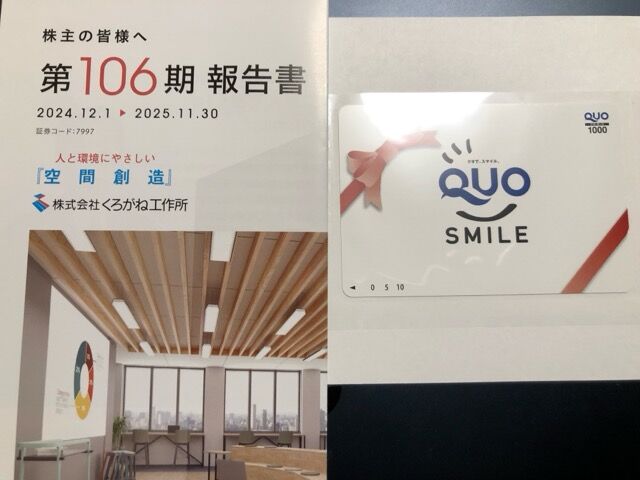 100株以上で1,000円のクオカード。優待利回りは1.04%。