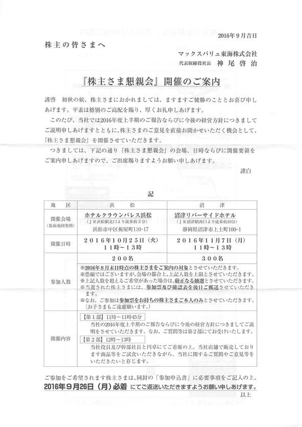 9/17にマックスバリュ東海から株主懇親会の案内が届いた。普通郵便。