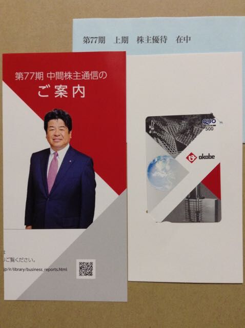 9/7に岡部から株主優待が届いた。普通郵便、中間報告書同封。