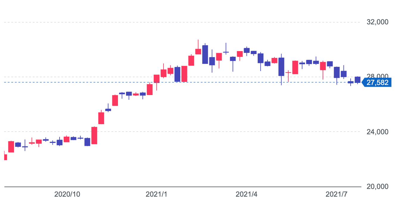 この1ヶ月はじり安。新型コロナウイルス感染症の変異株を原因とする感染拡大を受け米国市場などの株安影響で日経平均も安くなる。2万9千円割れ、2万8千円割れと底値が下がってきている。国内では東京オリンピックが開幕し、外国人選手の流入や自粛ムードの緩みなどで東京などでは感染者数が増加。一方、ワクチン接種が進み死亡者や重症者は減少しており、これらがどちらの方向に向かうか予断を許さない状況は続く。