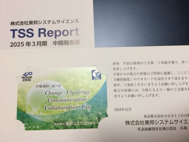 100株保有でQUOカード1,000円のはずだが写真を撮り忘れたようで残っていない。なので汎用カードなのか自社オリジナルデザインなのかすらわからない。オリジナルデザインだとすると手元に残っていないので既に使ってしまった後だろう。優待利回りは0.31%。3年以上継続保有で+1,000円分。