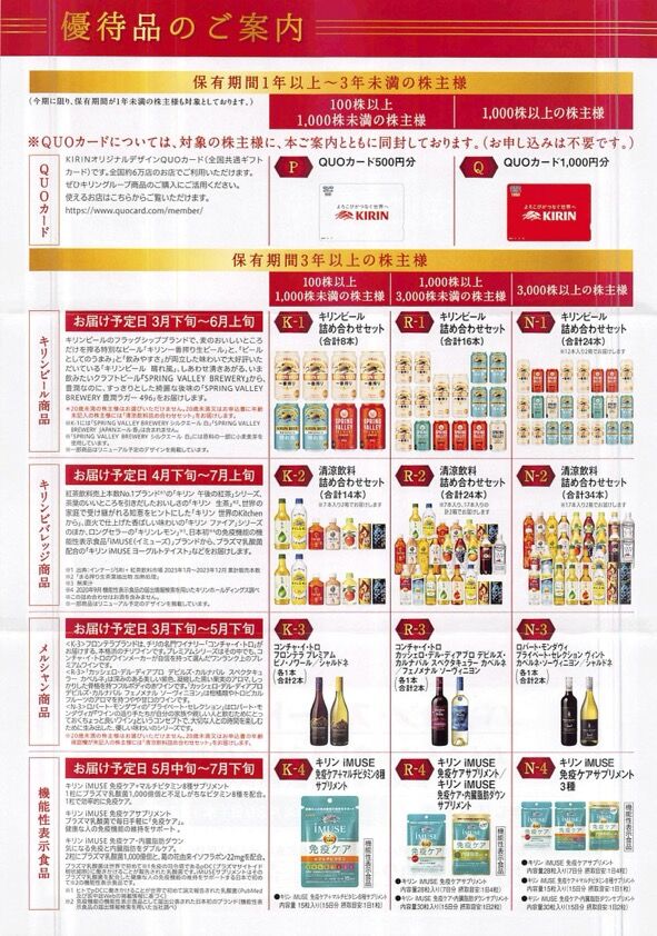 キリン:商品選択 2024年12月権利(2503)・1年以上3年未満はQUOカード、3年以上でビール等