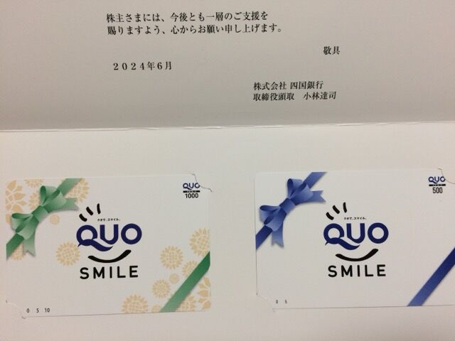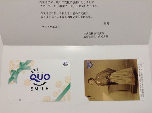 200株を1年以上継続保有で1,500円のクオカード。またしても写真撮り忘れ。標準デザインの1,000円券と500円券だったと思う。100株の場合には500円で優待利回りは0.36%。200株の優待利回りは0.54%と少し良くなる。確か長期保有条件がつく前に購入して以後継続保有しているのだったと思う。
