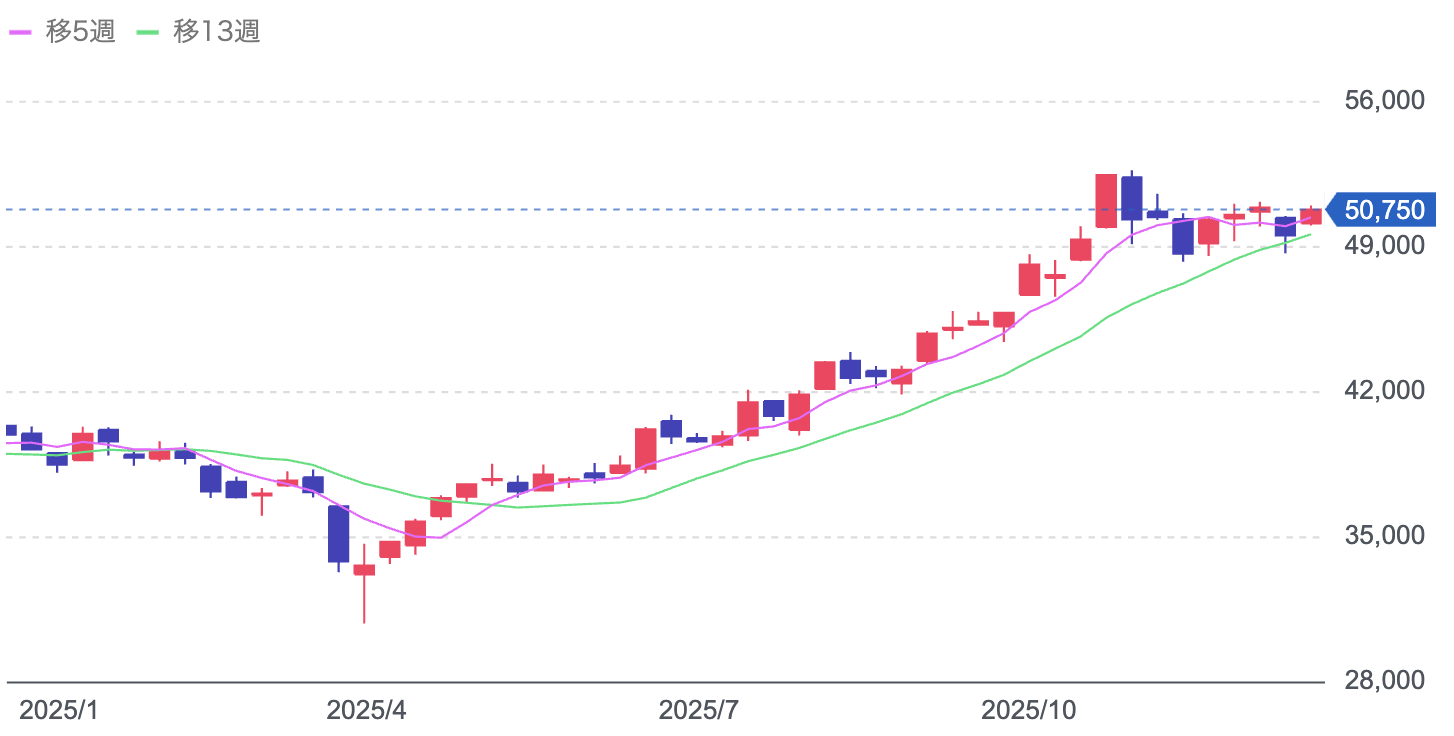 12月の日経平均株価は一時4万9千円を割れることもあったが概ね4万9千円から5万円1千円の範囲で上下。やや弱含みの動きながら1年前からは1万円上での停滞。12/12に米国FOMCで金利0.25ポイントの引き下げ、12/19には日銀が政策金利を0.75%まで引き上げた。が概ね事前の予測通りでサプライズはなし。日経平均株価は50,750.39円で昨年末比+27.21%前月末比で+2.40%上昇。TOPIXは2,766.78ポイントで昨年末比+22.91%のこ一ヶ月間で+2.01%の上昇。そしてTOPIXはこの日が史上最高値。日経平均株価が停滞している間に史上最高値を更新し続けていた。東証リート指数は2,026.66で昨年末比で+22.61%、この一ヶ月間では-0.40%。。